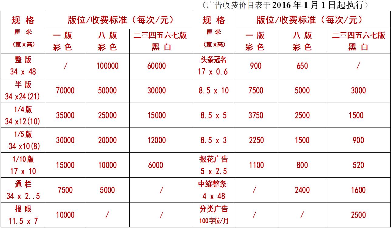 6、本报广告刊登规格有整版、1/2版、1/4版、1/5版、2/5版、1/10版等,其中一、四版为彩色广告;五、八版为套红广告;其余版面为黑白广告。