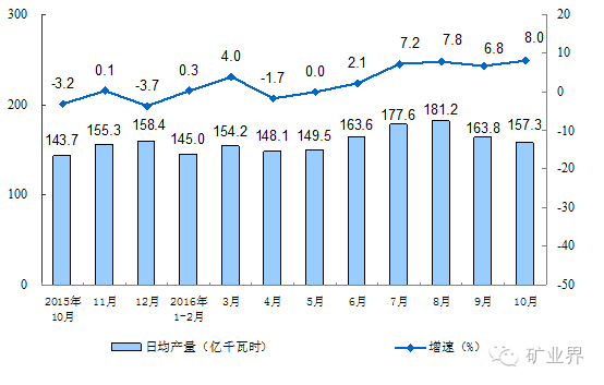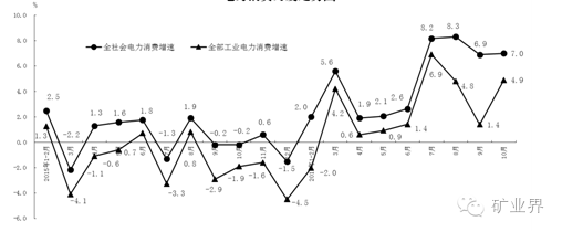 10月份,工业用电量同比增长4.9%,增速比上月加快3.5个百分点。其中,采矿业增长1.4%,上月为下降2.5%;制造业增长5.7%,比上月加快3.0个百分点;电力、燃气及水的生产和供应业增长2.8%,上月为下降4.9%。