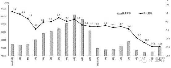 10月末,原煤库存4.7亿吨,同比下降14.5%,但比上月增加1234万吨。其中,生产企业库存与流通企业库存分别为1.6亿吨和1.3亿吨,与上月基本持平;受冬储煤因素的影响,消费企业库存1.8亿吨,比上月增加1242万吨。