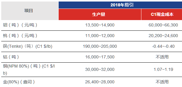 2018年公司公布的主要产品产量及现金成本指引如下: